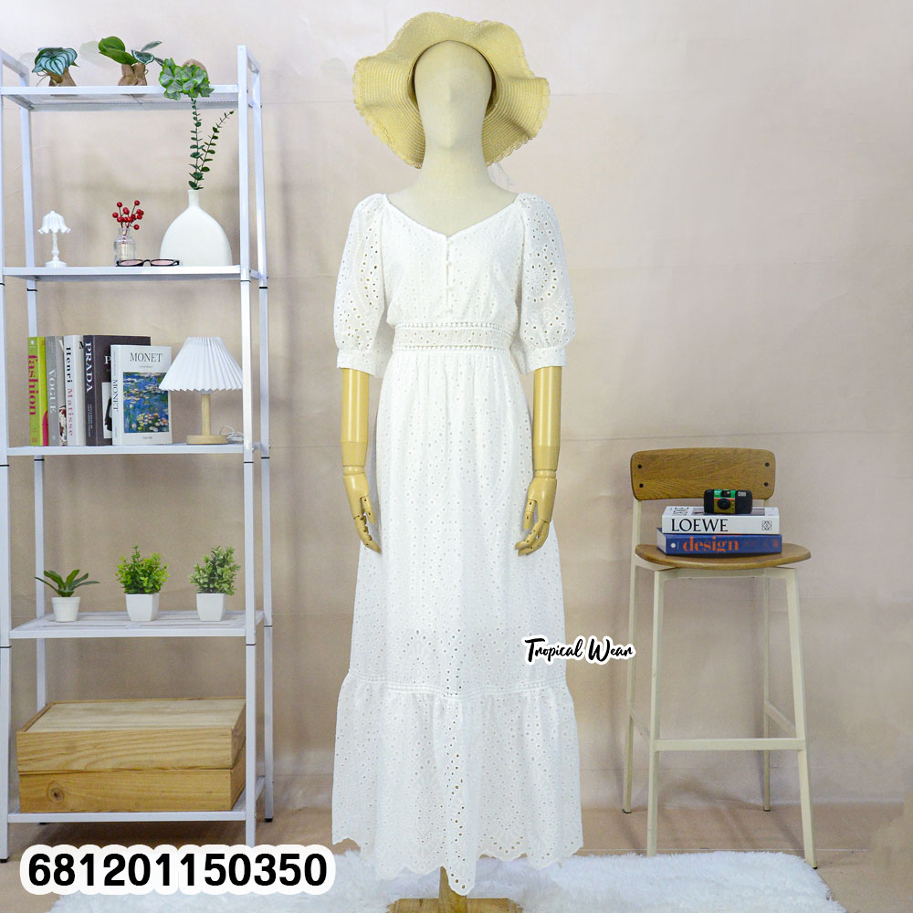 Crafted in airy cotton with delicate eyelet texture, this maxi dress feels soft against the skin. Moreover, the fabric is lightweight and naturally breathable, making it ideal for tropical climates. Therefore, it reduces overheating while maintaining structure. The free size design (Bust 34–38”, Waist 26–34”, Hip free, Length 54”) supports flexible fitting.