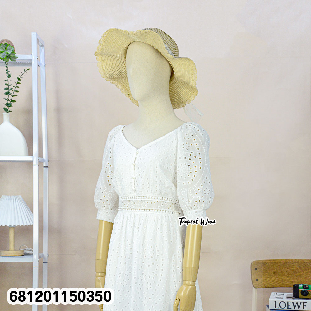 This lightweight white eyelet dress has strong resale appeal. For this reason, it suits boutiques, online sellers, and OEM brands seeking feminine summer collections. The classic white tone simplifies styling and increases repeat orders. Moreover, the free size format reduces stock risk for global buyers.