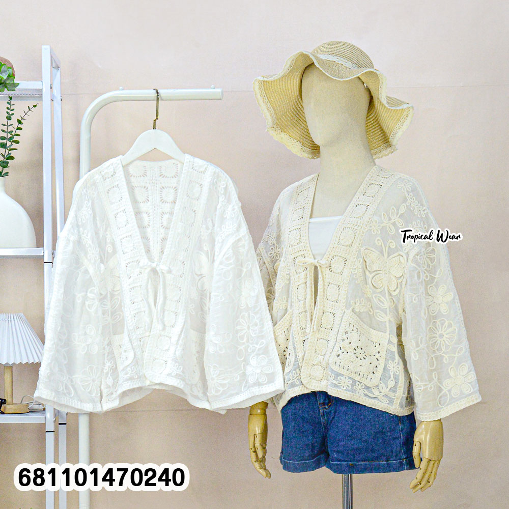 เสื้อคลุมลูกไม้ปักลายผีเสื้อดีไซน์กิโมโน สไตล์โบโฮ–วินเทจ เนื้อผ้าโปร่งเบา ใส่สบาย ทรงพริ้วคลุมสวย เพิ่มเสน่ห์ให้ลุคซัมเมอร์ รีสอร์ท และวันพักผ่อน ใส่คลุมทับเดรส เสื้อสายเดี่ยว หรือชุดว่ายน้ำก็สวยลงตัว