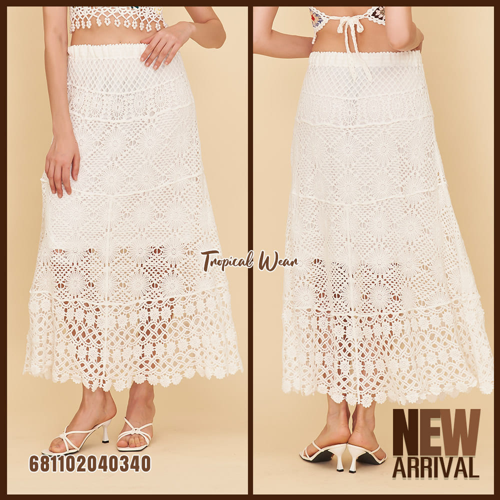 กระโปรงโครเชต์ลายดอกดีเทลสวยหวาน ต่อบล็อกงานลูกไม้แบบบาหลี ใส่แล้วพลิ้วเบา ดูยาวเรียว และให้ลุคโบโฮสุดละมุน เหมาะกับใส่เที่ยวทะเล คาเฟ่ หรือมิกซ์ลุคซัมเมอร์สุดชิค