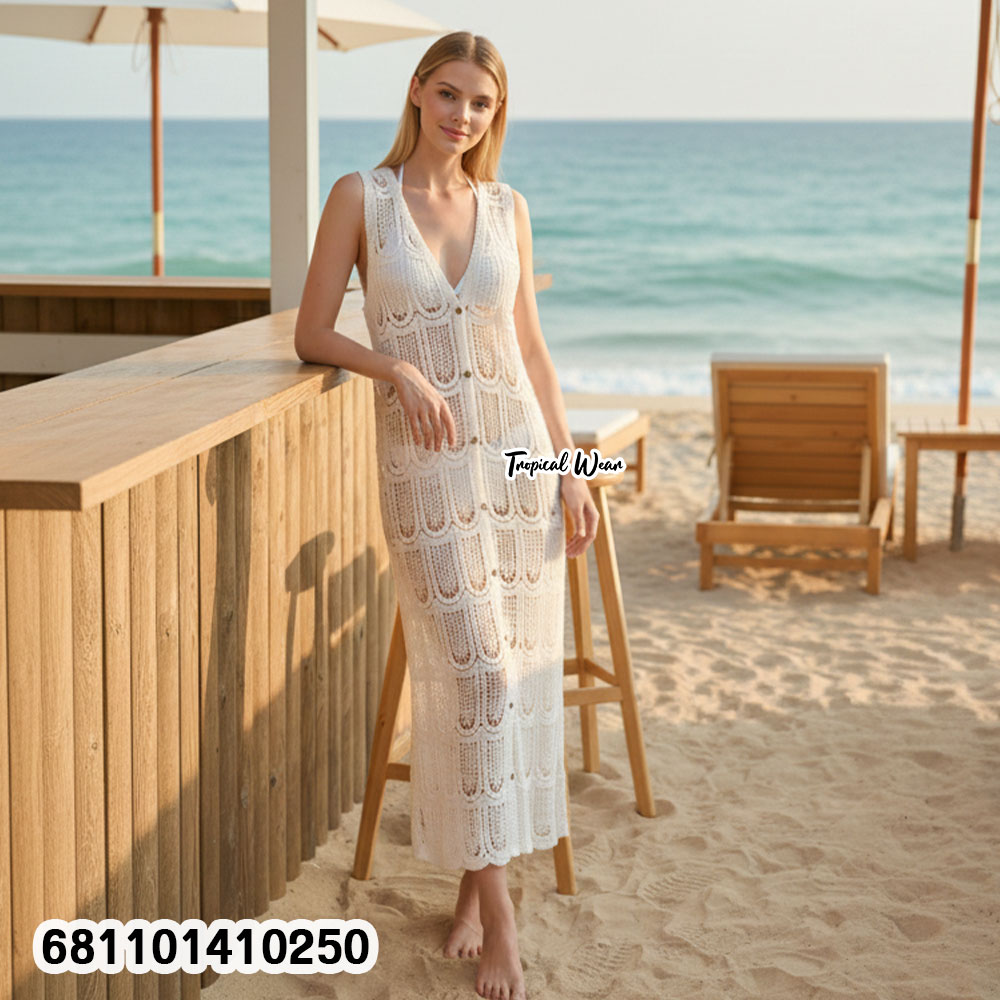 เสื้อคลุมโครเชต์ตัวยาวดีไซน์โบโฮ ลายถักสวยพริ้ว พร้อมกระดุมหน้า ใส่คลุมแล้วได้ลุคซัมเมอร์–รีสอร์ททันที เนื้อผ้าโปร่งเบา ใส่สบาย เหมาะสำหรับใส่ทับเดรส เสื้อสายเดี่ยว หรือชุดว่ายน้ำ เพิ่มเสน่ห์ให้ลุคดูมีสไตล์แบบ effortless