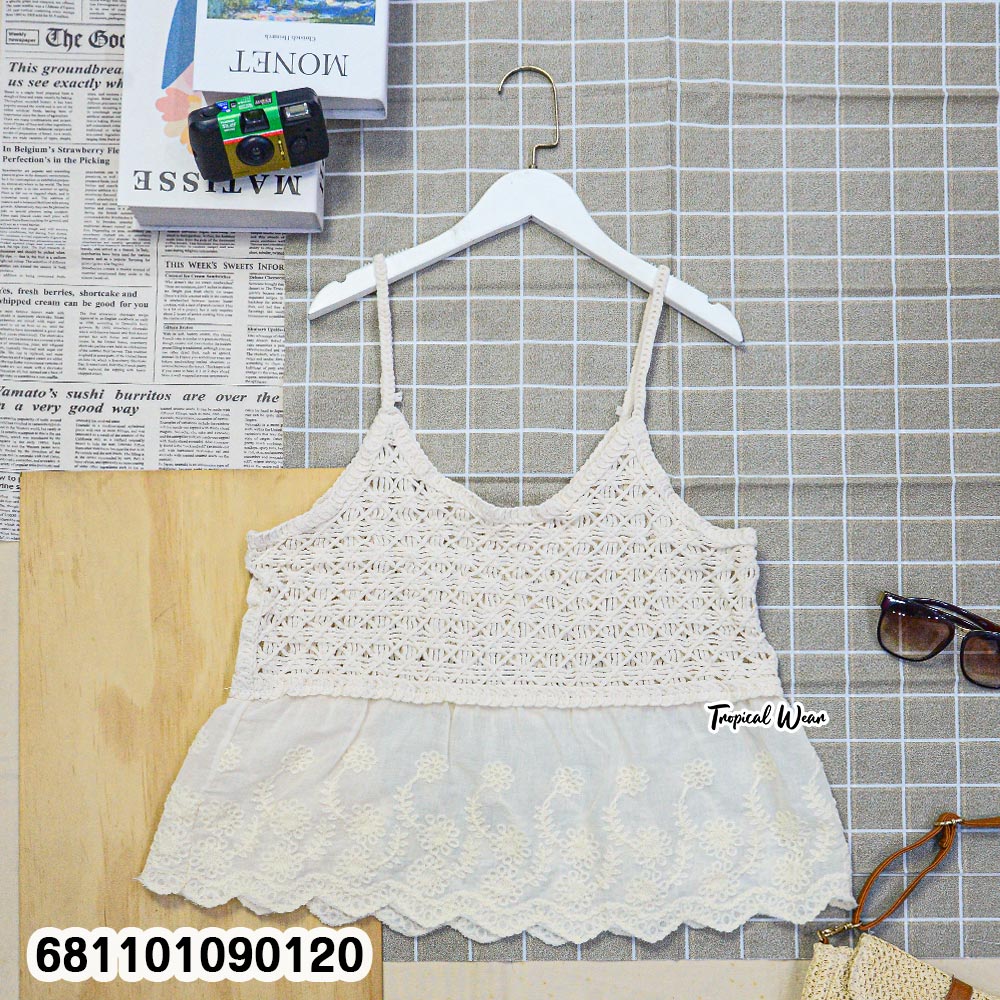 เสื้อสายเดี่ยวโครเชต์ลายดอกดีไซน์หวานละมุน มิกซ์ผ้าลูกไม้ชายระบายให้ลุคพลิ้วเบา ใส่สบาย ไม่ร้อน แมตช์ง่ายได้หลายสไตล์ เหมาะทั้งใส่เที่ยวทะเลและเดินชิลในเมือง